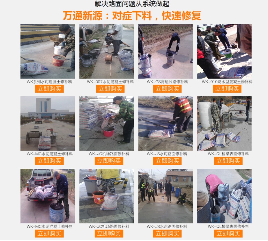 水泥混凝土修補(bǔ)專家----萬通新源中國專業(yè)水泥混凝土修補(bǔ)料材料供應(yīng)商!水泥混凝土修補(bǔ)料專門針對水泥混凝土路面的麻面、空鼓、起皮、脫殼、裂縫、漏筋等病害進(jìn)行及時(shí)修補(bǔ),直接涂抹在病害部位即可,有好的抗壓和粘接強(qiáng)度,可實(shí)現(xiàn)薄層修補(bǔ),在高速和高壓的行車狀態(tài)下不會(huì)出現(xiàn)破碎和脫落現(xiàn)象;凡是水泥混凝土表面病害均適用于本材料。
